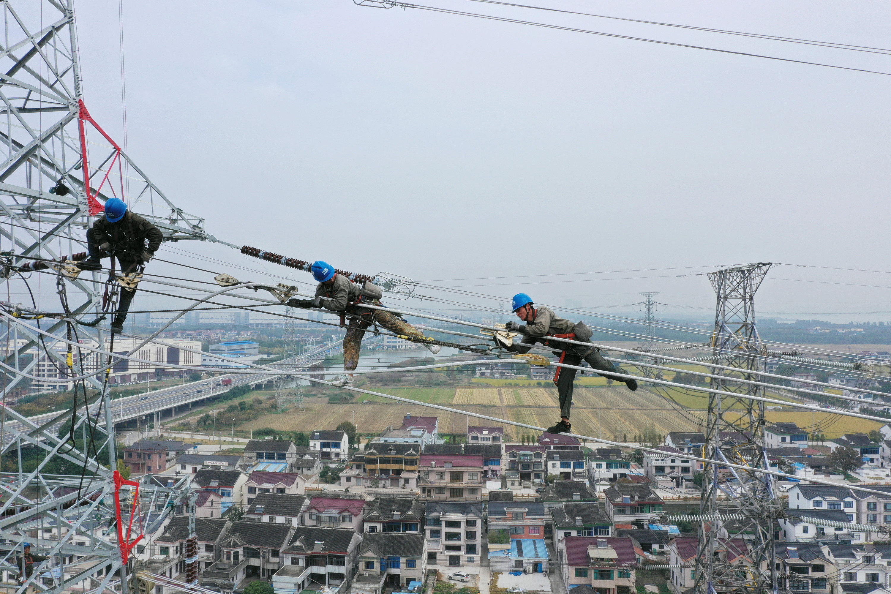 白鹤滩—江苏±800千伏特高压直流受端配套500千伏送出工程Ⅲ标段施工场景。陈康摄